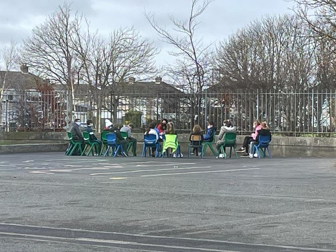 All classes have now elected their representatives for this school year. We hold monthly student council meetings on the last Friday of the month. The student council reps all wear their badges of office in school so we know who they are if we need them! Here is a photo of one our outdoor meetings!